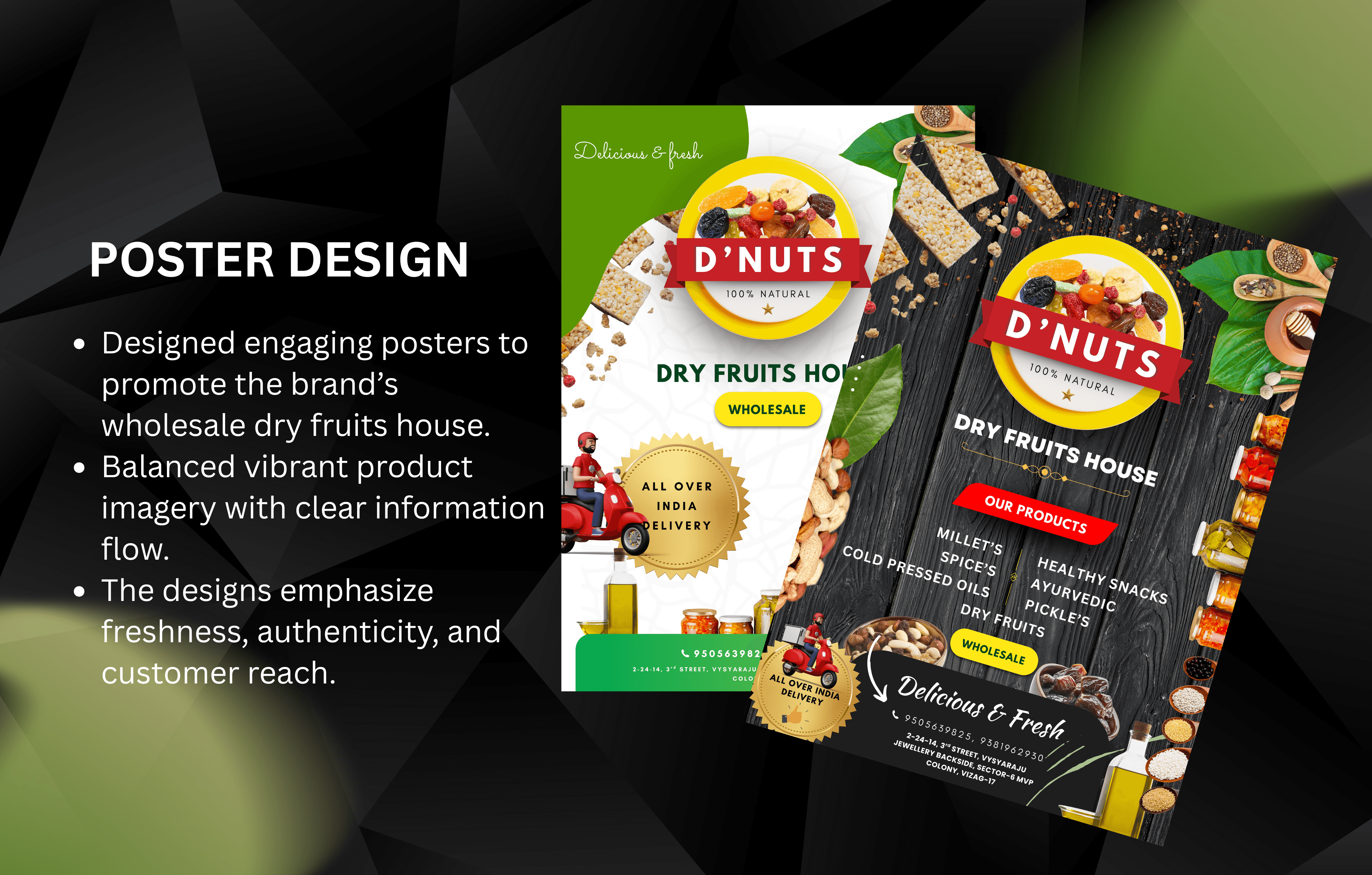 We designed a clean and versatile logo, developed branding guidelines, and created visually appealing posters and marketing materials to help D’Nuts stand out in a competitive market. The brand design conveys freshness, authenticity, and natural goodness—perfectly aligned with their product line.