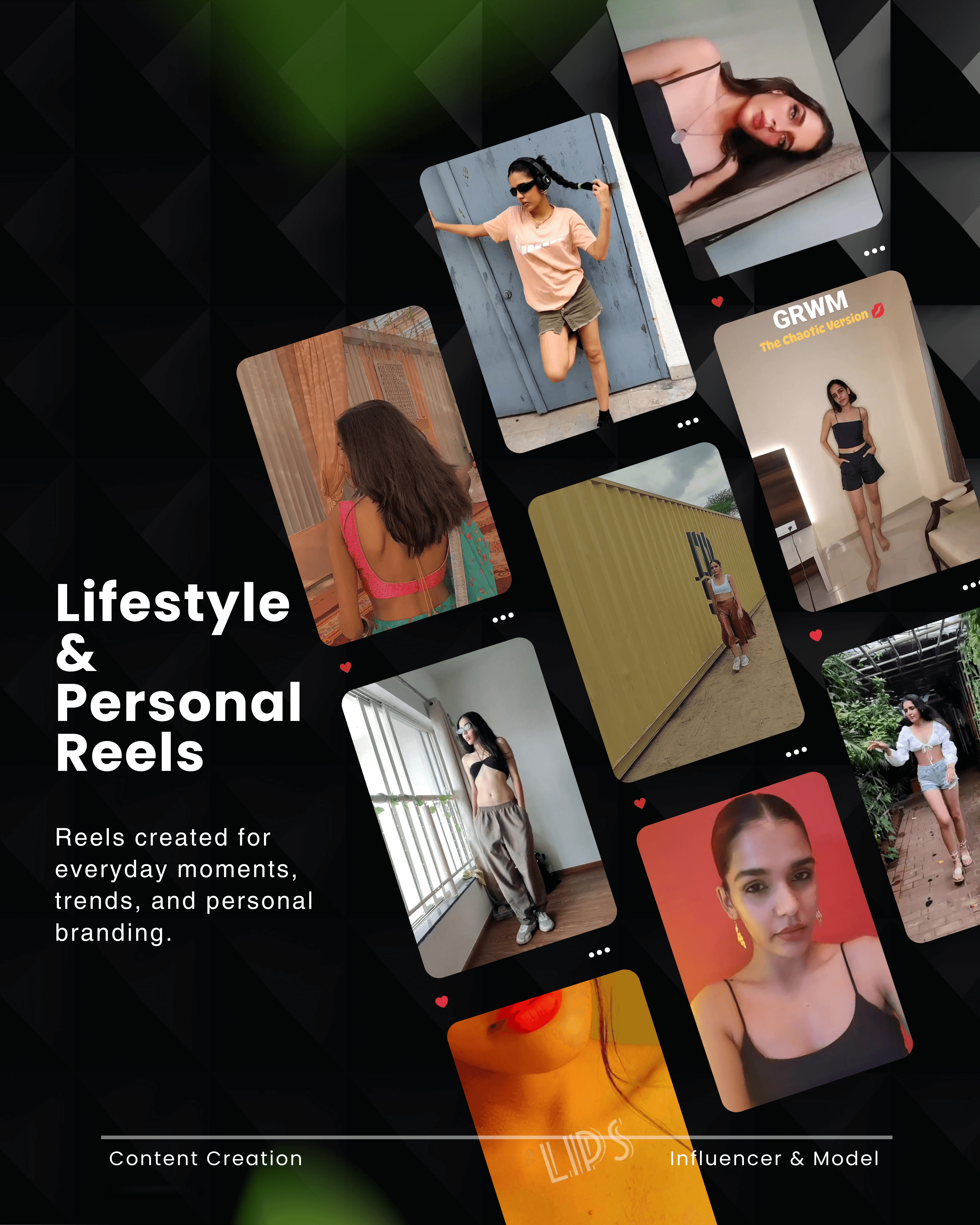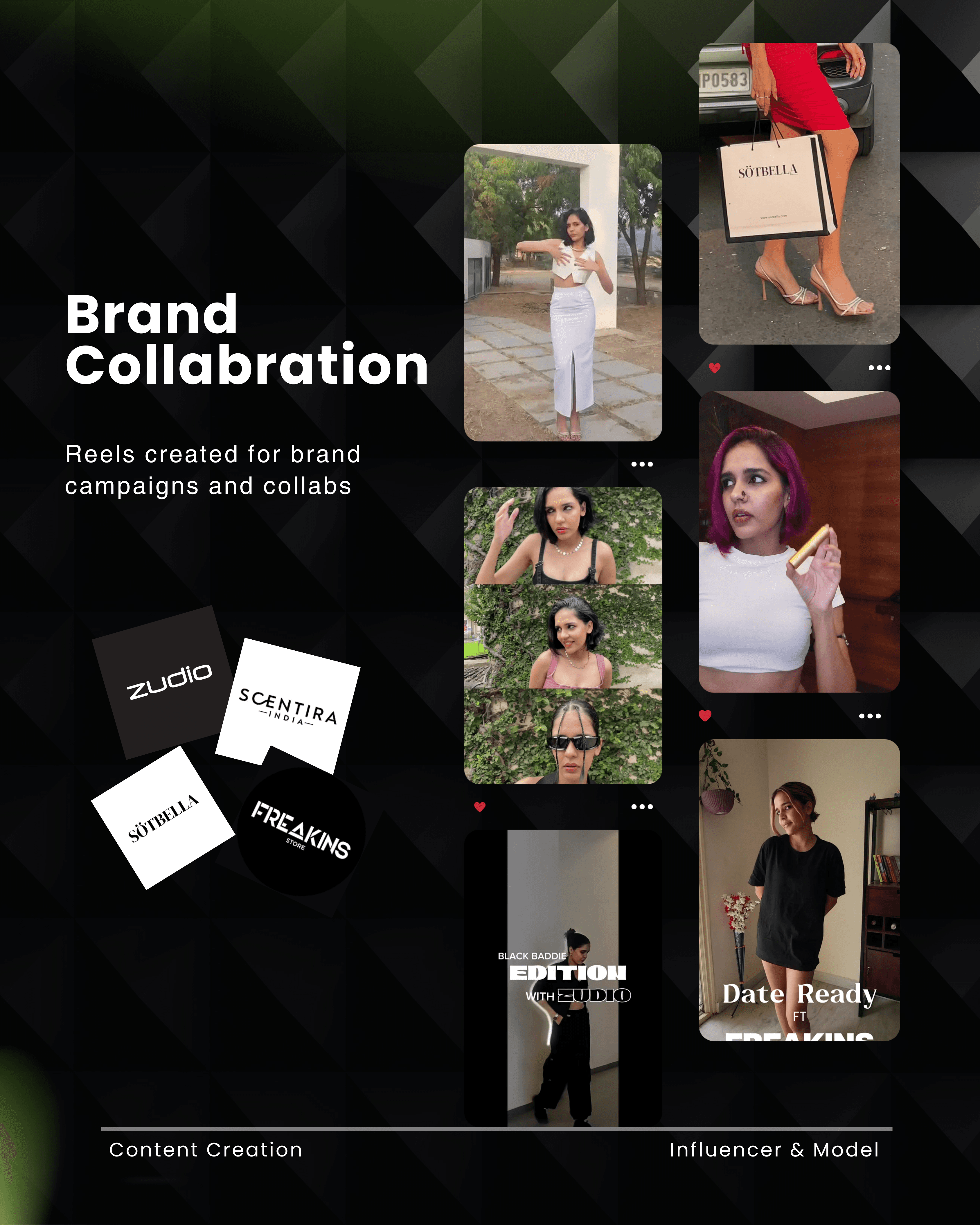 Neha Choudhary is a model and content creator who collaborates with prominent brands like Zudio, Casio, and Sotbella. We manage her social media presence—handling content planning, production, and post-editing—to showcase her authentic brand collaborations and personal style.